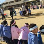 お餅つきをしました。 重たい杵を一生懸命持って、よいしょ!よいしょ!とみているお友達も一緒に叫んで7回ずつおもちをつきました。「もちもち~!」「重たいよ~!」と大きなおもちを見てとても楽しんでました。 お餅はお家に持って帰りました。