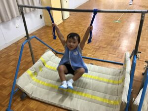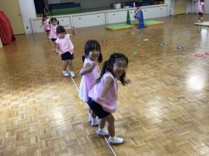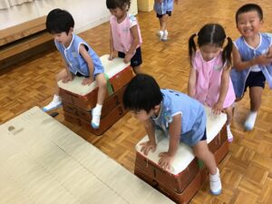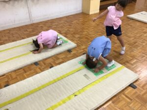 2学期に入りました。年少組の体操ではサーキットをしています! でんぐり返しや綱渡り、ぶら下がり、跳び箱に乗ったりなど元気いっぱい身体を動かして遊びました。 マットにあるマークに手足を置いて回るでんぐり返しは、初めはなかなかできないお友達もとっても上手にできるようになりました! いろいろな体育遊びに子どもたちはとても楽しんでいる様子でした。