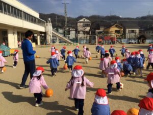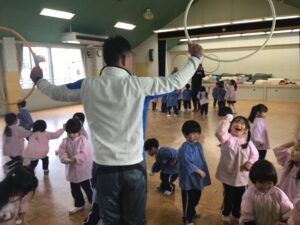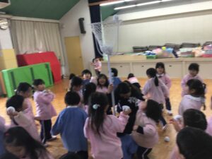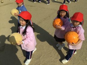 サッカー体験では、ボールをパンに見立ててコロコロ転がしたり、足でモミモミしたりしたりしてゆっくりボールと仲良くなっていました。最後はみんなでキックしてゴール!! サッカーがとても上手になりました。スポーツ体験では、玉入れをしました。初めはフラフープに玉を入れて遊び、その後チームに分かれて玉入れをしました。とっても楽しそうな様子がみられました。