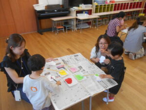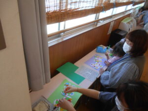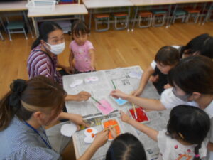絵の具を使って製作をしました。真っ白のちょうちょさんを半分に折って好きな色の絵の具で模様を描いて、魔法をかけて折り返して聞くと。。。「わあ!きれい」とってもかわいい模様に変身しました。モールで触覚をつけて色画用紙に貼って仕上げました。みんなのにこにこ笑顔がみれました。