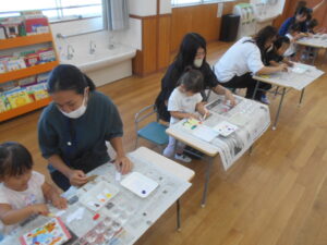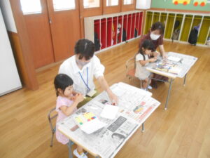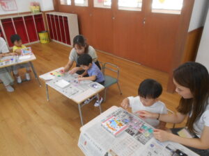 まだまだ暑い日が続いていますが、今日も元気にすくすくクラブがスタートしました。 今日はたまごパックを使って色水遊びをしました。小さく切った画用紙にマーカーで色をつけて、お水が入ったたまごパックにつけると。。。お水の色が変身!!きれいな赤やピンク、青色のお水になりました。ゼリーみたいとよろこんで遊んでくれました。