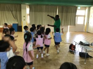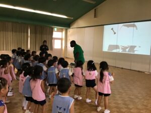 サイバードリームの中に出てくる英語の先生が幼稚園にレッスンに来てくれました。毎日帰る前の10分程、ABCの歌や国の名前、色などの英語をテレビに出てくる画像を見たり聞いたりしながら一生懸命真似っこして楽しくお勉強をしてくれています。テレビの中に出てきている先生が実際に教えに来てくれて笑顔を浮かべてレッスンに参加していました。体を使いながら先生の発音の真似をし楽しそうな姿がたくさん見られました。これからも英語に興味を持ちながら楽しく学んでいきたいです。