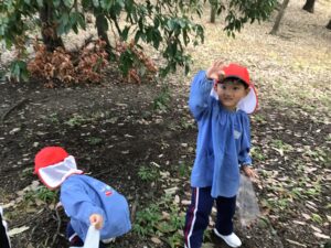 楽しみにしていたどんぐり拾いの日がやってきました。朝、登園してくると目をキラキラさせながらワクワクしている様子で「早くどんぐり拾いに行きたーい!!」と言っていました。園バスに乗っていざ、到着すると早速どんぐりが落ちていました。葉っぱや、帽子のかぶったどんぐりを見つけて「やったー!どんぐりみーつけた!!」みんなの嬉しそうな声が色んな所から聞こえて来て、たくさんのどんぐりに出会えて嬉しかったです。