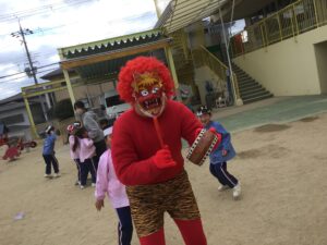 2月3日は節分の日!幼稚園のお友達みんなで、戸外に集まり豆まきや恵方巻のお話を聞いたり、手遊びをして遊んでいると鬼さんがやってきました!泣いているお友達もたくさんいましたが、「鬼はーそと!福はーうち!」と一生懸命お豆を投げて鬼さんを退治しました。