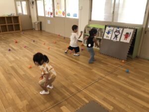 今日はすくすくクラブのみんなと親子体操です。早く体操したーい!そんな声も聞こえてきました。まずは準備運動をしっかりしてランニングをしたりストレッチをしました。ボールを横に渡していくゲームをしたり、袋をキャッチするゲームもしました。その後にボールを使って転がしたり、投げて的に当てたりしてボール遊びを楽しみました。