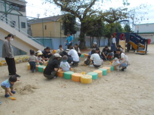 秋風が吹き、お外で遊ぶのにもってこいの気持ちのいい季節になりました。 今日は久しぶりのお砂遊び。スコップを使ってお山を作ったり、おままごとセットでごはんを作ったり。お友達やママと一緒に楽しい時間を過ごしました。1歳のお誕生日を迎え、よちよちクラブに初めて参加してくれるお友達も増えてきました。初めてのお砂遊び、初めてのお歌、初めてのお友達、いろんな初めてをよちよちクラブで体験してみてください。