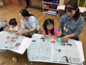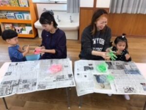 今日も元気いっぱいよちよちクラブがはじまりました。季節のうたは上手にまねっこできるお友達が増えてきました。 今日は小麦粉粘土を作ってあそびました。小麦粉に魔法のお水を入れると、赤や黄、緑色に変身!こねこねとおうちの人とこねてできあがり。長いへびをつくったりお花やアンパンマン、みんなうれしそうに遊んでくれました。