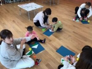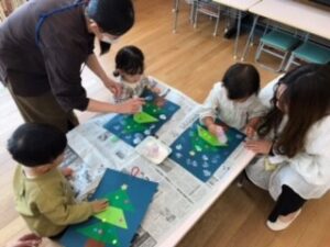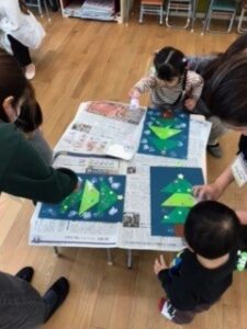 今日も元気いっぱいよちよちクラブがはじまりました。やきいもグーチーパーやクリスマスの手遊びもしました。 製作ではスタンプ遊びをしました。折り紙にのりをつけて重ねて貼るとクリスマスツリーの完成!そこにプチプチのスタンプを押すとわあ雪みたい。かわいくてたくさん押してくれるお友だちもいました。お家で飾ってくださいね。