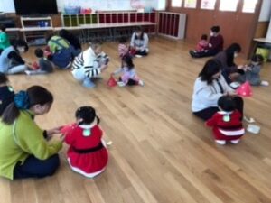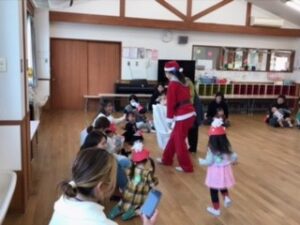 今日はみんなが楽しみにしてくれていたよちよちクラブのクリスマス会でした。 サンタさんの赤い帽子にきらきらシールを貼ったり、白いポンポンをつけてかわいく変身!ジングルベルのうたを歌っているとシャンシャンシャン鈴の音。サンタさんが来てくれました。プレゼントをもらうとみんなにっこり笑顔。楽しいクリスマス会になりました。