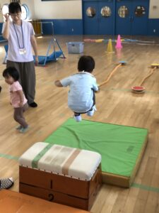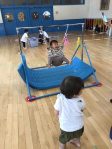 今日も元気によちよちクラブのお友だちが来てくれました。小ホールでマットや鉄棒、フープなどを出して運動遊びをしました。細い道を落ちない様に渡ったり、鉄棒にぶら下がったりトランポリンをしたりたくさん体を動かしました。お気に入りの所を見つけて何回も行ってましたね!しっかり体を動かして元気な体を作りましょうね!