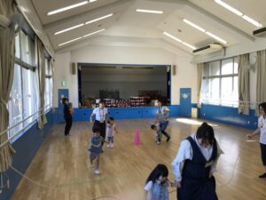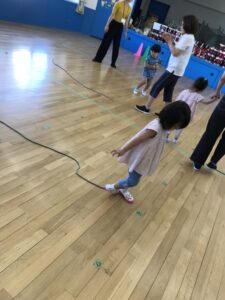 少しずつ涼しくなって体を動かしやすい季節になってきましたね。今日は縄で丸を作ってお引越しゲームをしたり、縄でお靴をお散歩させたり縄の上を落ちない様に歩いたり、縄を使っていろんな遊びをしました。最後は長い長~い縄でお母さんと一緒にジャンプ!次はヘビさんみたいににょろにょろしてる縄をジャンプ!