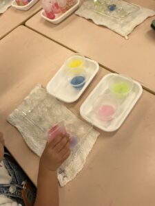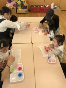 今日は朝から秋晴れのいいお天気になりました。お散歩もお友だち同士で手を繋いで楽しくできましたね!さあ今日はみんなの楽しみにしていた色水遊びです。卵のパックに赤色のお水を入れて、次に青色のお水をいれると・・・わあ!紫になった~!みんな早くやりたーい!たくさんの声が聞こえてきました。やり始めるとみんなキラキラしたお顔で楽しい時間を過ごせました。